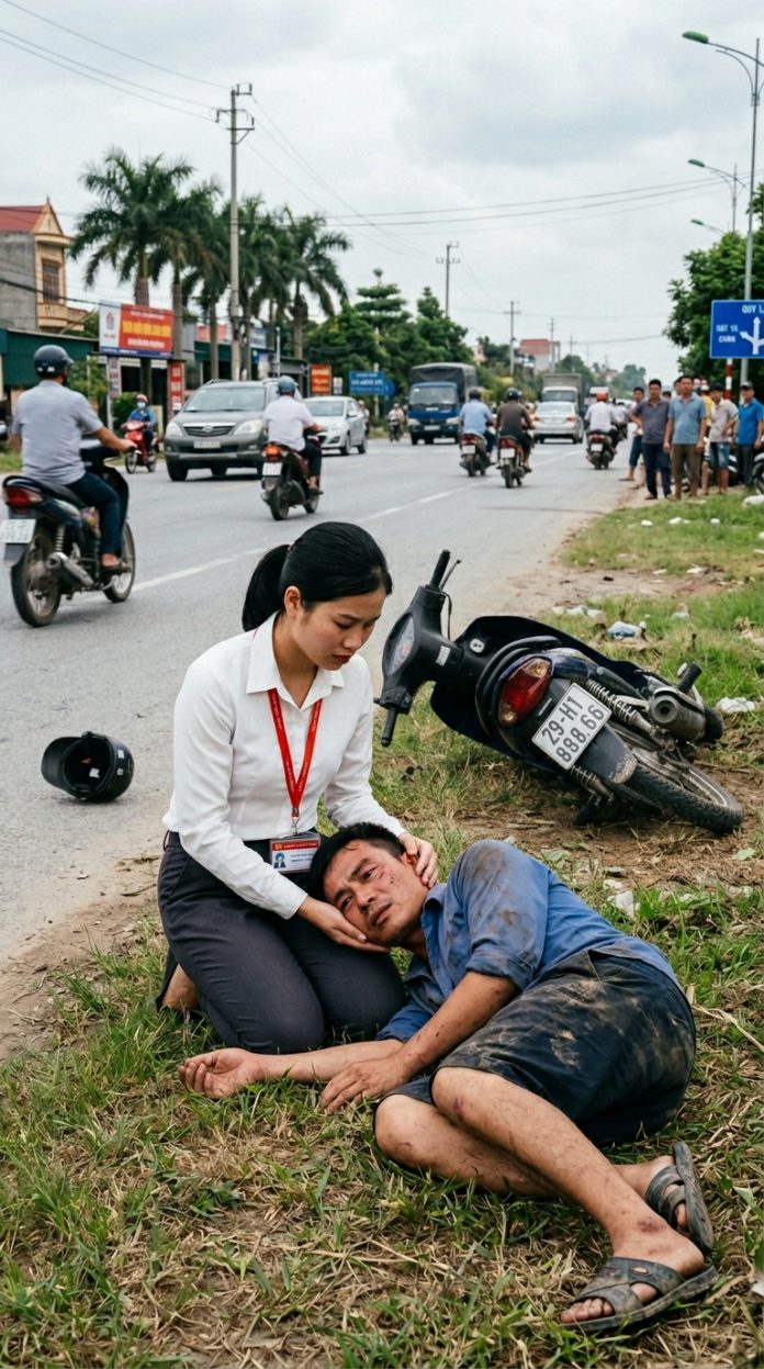 Khi đi ngang đoạn đường vắng, Lan bỗng thấy một người đàn ông trung niên nằm bên lề đường, chiếc xe máy đổ nghiêng gần đó. Ông dường như vừa gặp t-ai n-ạn. Quần áo dính bụi, trán bị tr-ầy x-ước, mắt nhắm nghiền.