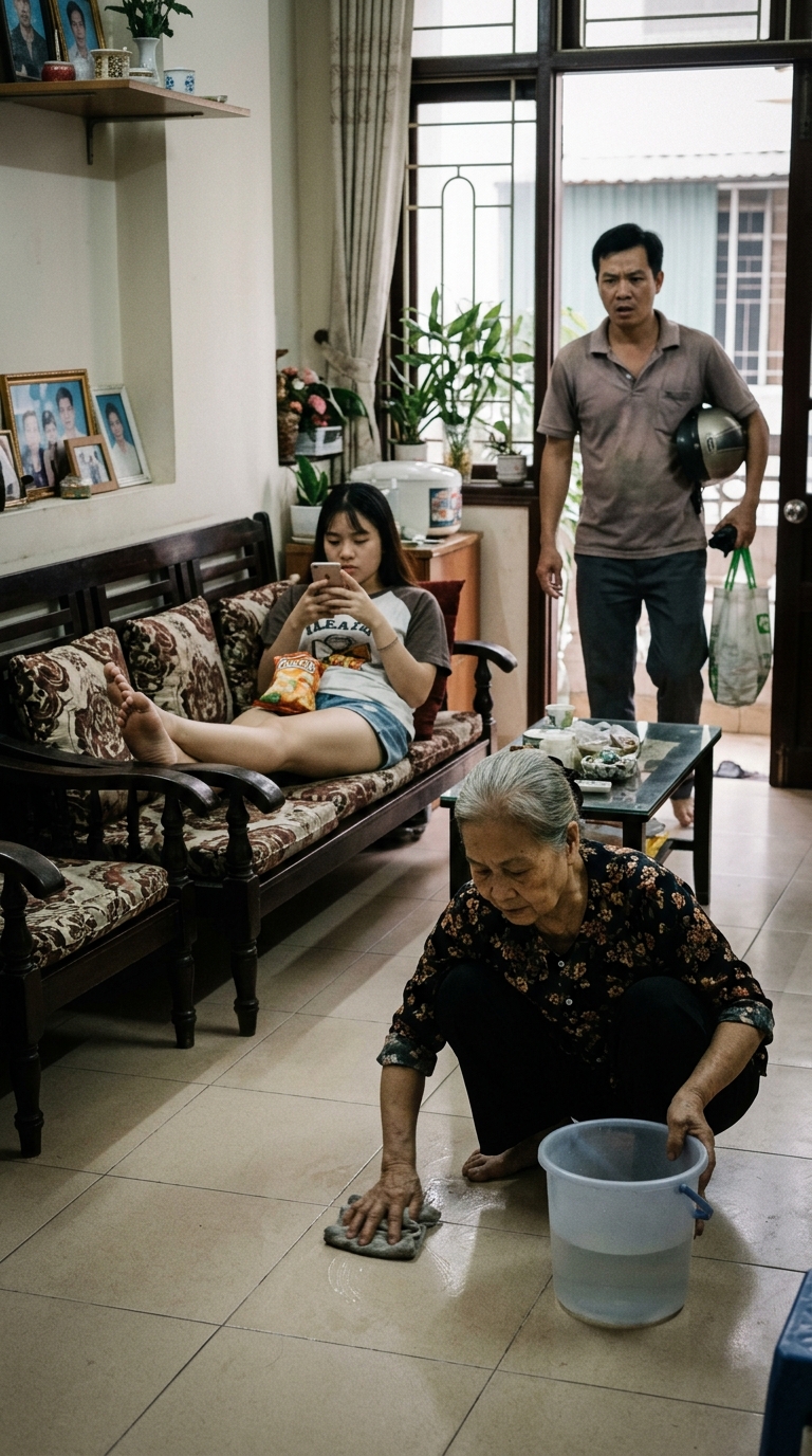 Nỗi nhục nhã ê chề dâng lên trong lòng, nhưng vì thương con, bà Lụa nuốt nước mắt vào trong. Bà lụi cụi lau từng kẽ gạch, đôi bàn tay gầy guộc run rẩy bê chậu nước nặng trĩu. Bà tự trấn an mình: “Chắc nó bận quá nên cáu gắt, mình làm giúp con tí việc có sao đâu”.