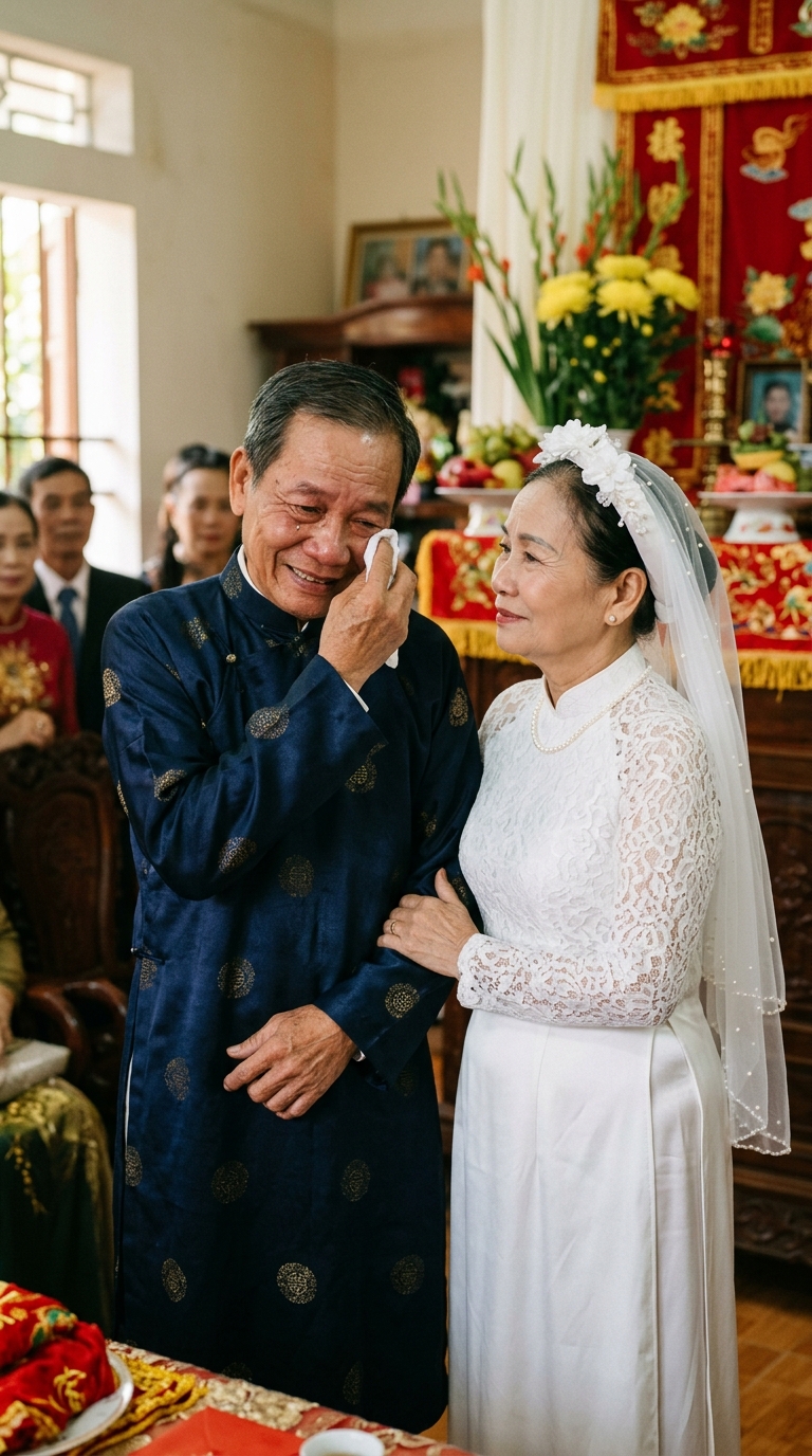 Ngày cưới, tôi mặc áo dài gấm màu nâu sẫm, cô mặc áo dài lụa trắng, tóc vấn đơn giản, cài một chiếc kẹp ngọc trai nhỏ xíu. Bạn bè, hàng xóm đến chúc mừng đông đủ. Ai cũng bảo: “Trông cô chú như hồi trẻ lại.”