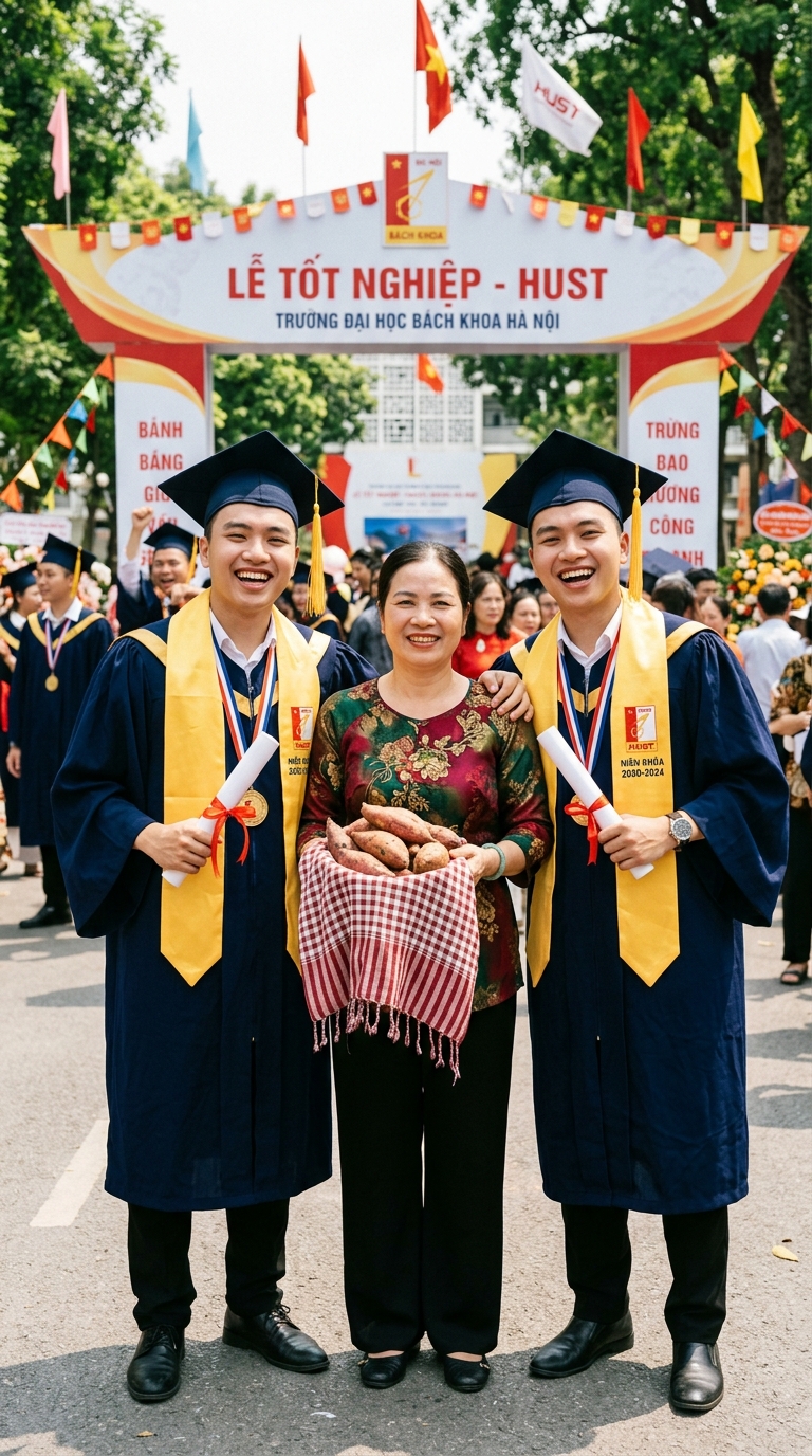 Tôi đứng lặng người giữa sân trường lộng lẫy, tay vẫn cầm mấy tờ tiền con vừa đưa. Dưới chân tôi, túi khoai lang lăn lóc, một vài củ bị dập, bó rau cải xanh mướt giờ héo rũ vì nắng và vì sự ghẻ lạnh.