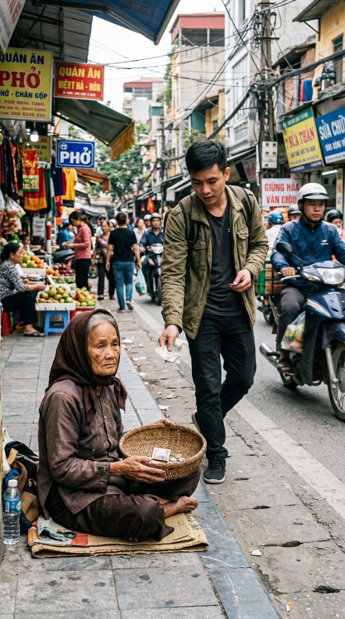 Thế mà bây giờ bà đứng trước tôi, dáng co ro, ánh mắt tránh né, bàn tay run run. Tôi không đưa tiền ngay. Tôi mở ví, rút một tờ năm mươi ngàn, nhưng lại cảm thấy nghẹn nơi cổ. Bà nhận lấy, cúi đầu cảm ơn rất khẽ rồi quay lưng đi vội, như sợ tôi kịp hỏi điều gì.