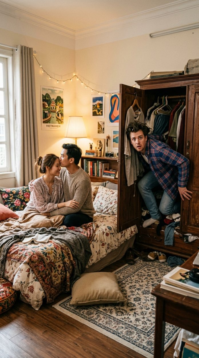 Cánh cửa tủ quần áo âm tường đối diện giường, bị dính hờ sau nhiều năm sử dụng, đã bật tung ra do chấn động mạnh lúc họ vừa ngã xuống giường.