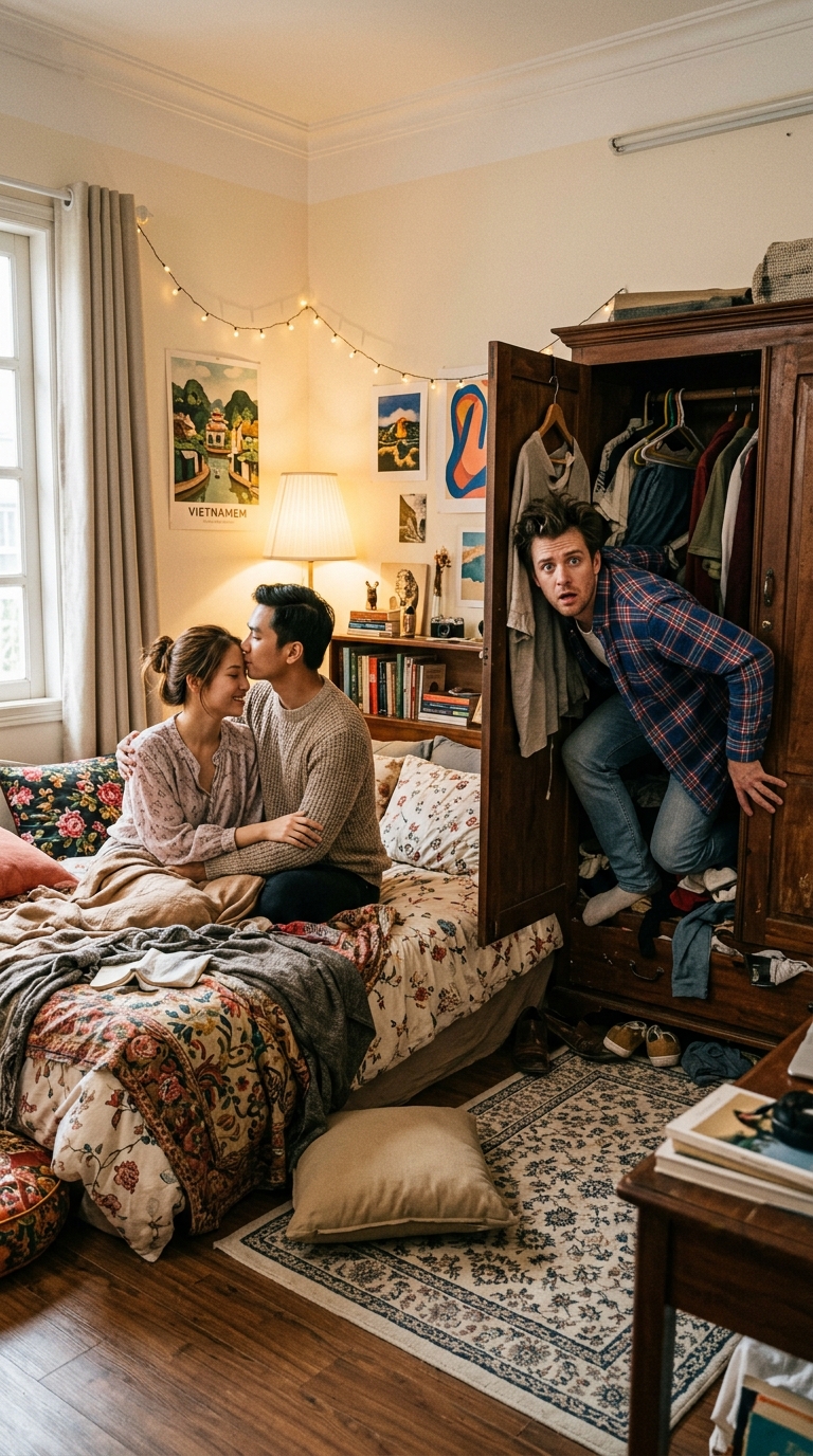 Linh ngồi dậy, rướn người sát vào tai anh, hơi thở thơm tho nhưng khiến Tùng rùng mình ớn lạnh: “Cánh tủ mở ra hơi sớm, em định đợi đến khi anh ngủ say cơ. Nhưng không sao… sự phấn khích này cũng là một loại ‘đỉnh điểm’ mà, phải không anh yêu?”