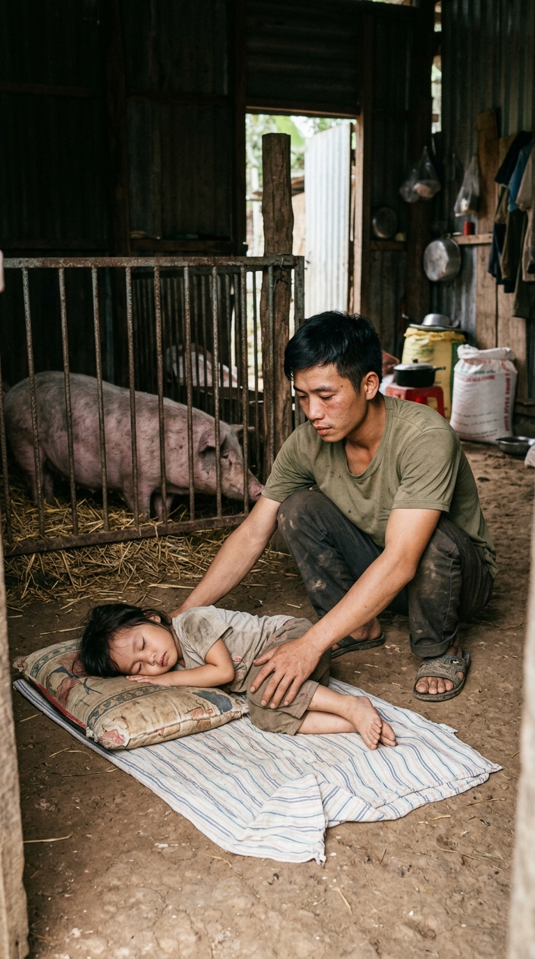 Trên một tấm giường xếp cũ, không màn, không chiếu — bé Vy đang co ro quấn tấm chăn mỏng như khăn giấy, ngay bên cạnh bức tường chuồng lợn còn lấm bùn.