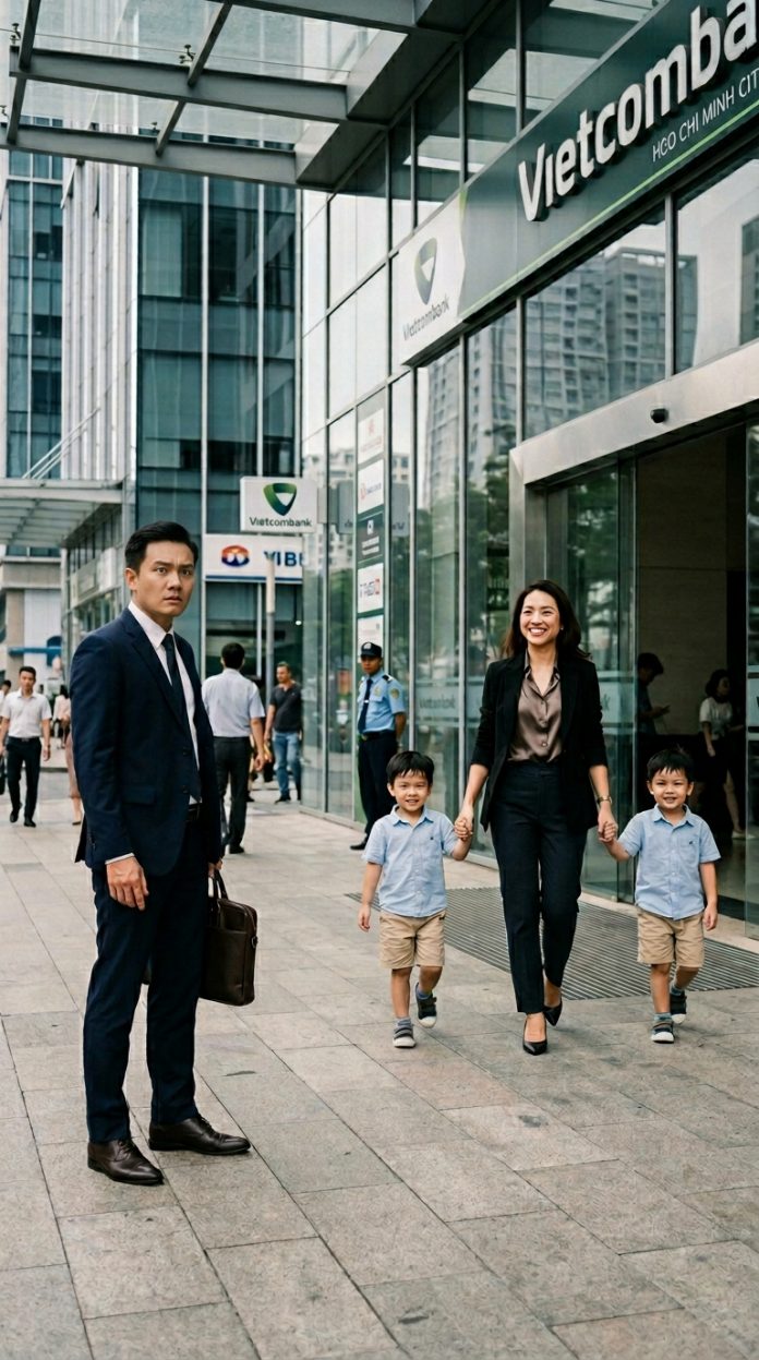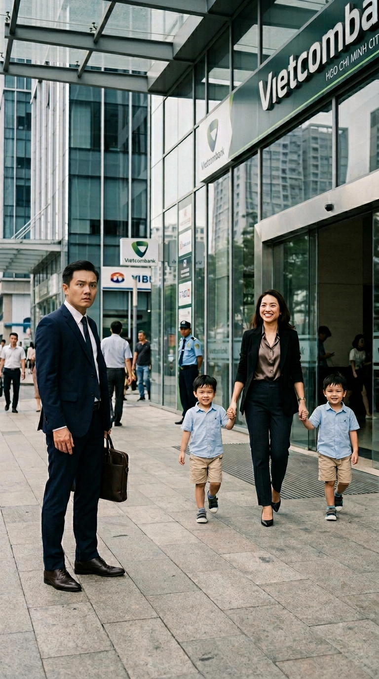 Lan Chi bước thẳng ra chiếc xe sang trọng đang chờ sẵn. Hai cậu con trai vẫy tay gọi mẹ, nụ cười rạng rỡ. Chiếc xe lăn bánh, bỏ lại Hùng đứng chôn chân giữa sảnh, xung quanh là ánh đèn hào nhoáng nhưng lạnh lẽo.