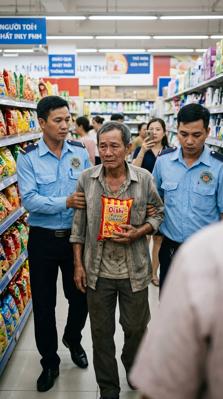 Cụ bị kéo vào phòng giám sát. Gói bánh đặt trên bàn như một bằng chứng. Cụ ngồi co ro trên ghế nhựa, hai tay chắp lại, run rẩy: