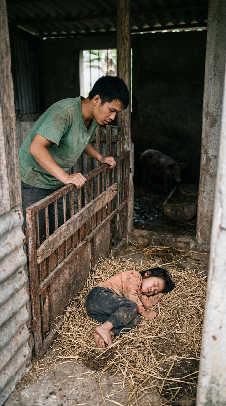Anh Nam như bị ai tạt nước lạnh. Anh lao ra sau nhà, chân vấp bậc, trượt trên nền đất bùn. Chuồng lợn nằm sát rào, mái tôn thấp, đèn vàng yếu ớt. Ngay cạnh máng rửa, dưới tấm bạt ẩm, bé Lan co ro, ôm con gấu bông cũ. Mặt con lấm lem, tóc dính bùn, đôi bàn chân trần tím vì lạnh. Mùi hôi nồng nặc bao quanh.