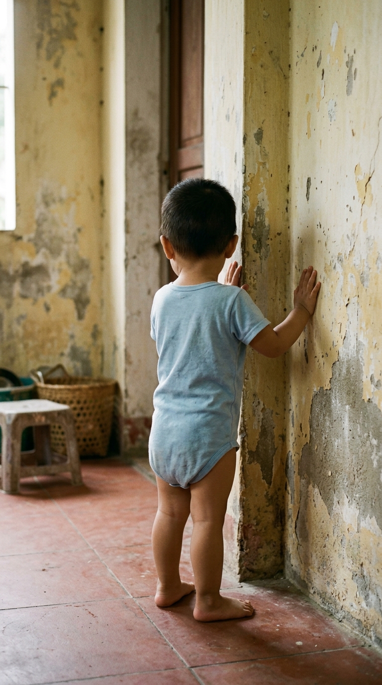 Tại một khu tập thể cũ ở quận Tân Bình, TP. Hồ Chí Minh, những bức tường loang lổ và nền gạch bạc màu kể câu chuyện về một thời đã qua. Nguyễn Văn Hùng, 34 tuổi, một kỹ sư xây dựng, sống cùng con trai nhỏ, bé Tuấn, trong căn hộ nhỏ đầy ký ức đau buồn. Một năm trước, vợ Hùng, chị Mai, qua đời do biến chứng khi sinh Tuấn, để lại anh một mình nuôi con giữa nỗi đau mất mát. Tuấn, mới tròn một tuổi, ít khóc, ít cười, lặng lẽ đến lạ thường. Hành vi bất thường của cậu bé – liên tục úp mặt vào tường – và ba từ thì thầm khiến Hùng sốc nặng, mở ra một bí mật đau lòng, đồng thời dạy anh bài học về sự lắng nghe và tình yêu thương.