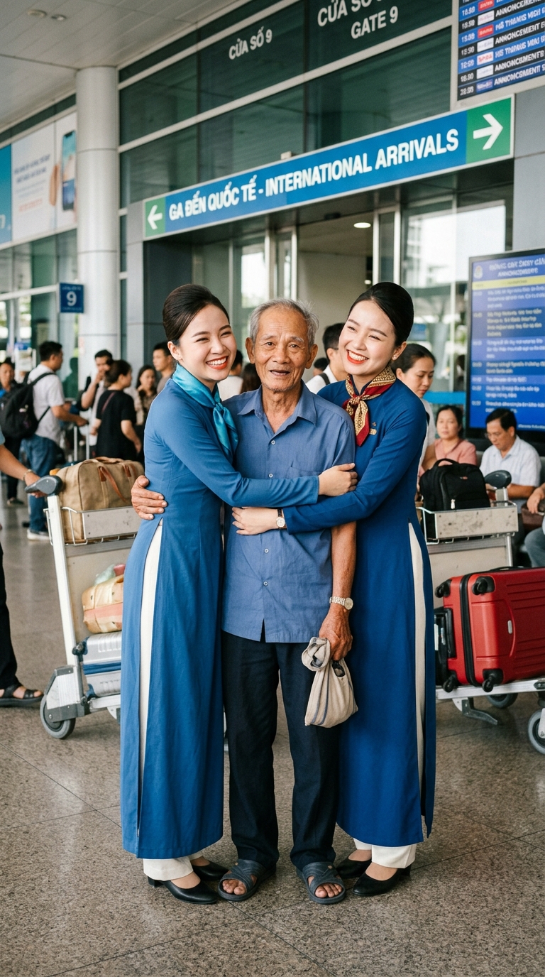 Hôm ấy, ông mặc bộ quần áo mới nhất – cũng chỉ là chiếc áo sơ mi trắng đơn giản mà hai con mua tặng. Bước vào khán phòng sáng rực ánh đèn, ông thấy hai cô gái trong bộ đồng phục phi công chỉnh tề, sải bước tự tin trên sân khấu. Lúc MC xướng tên, cả hội trường vỗ tay vang dội.