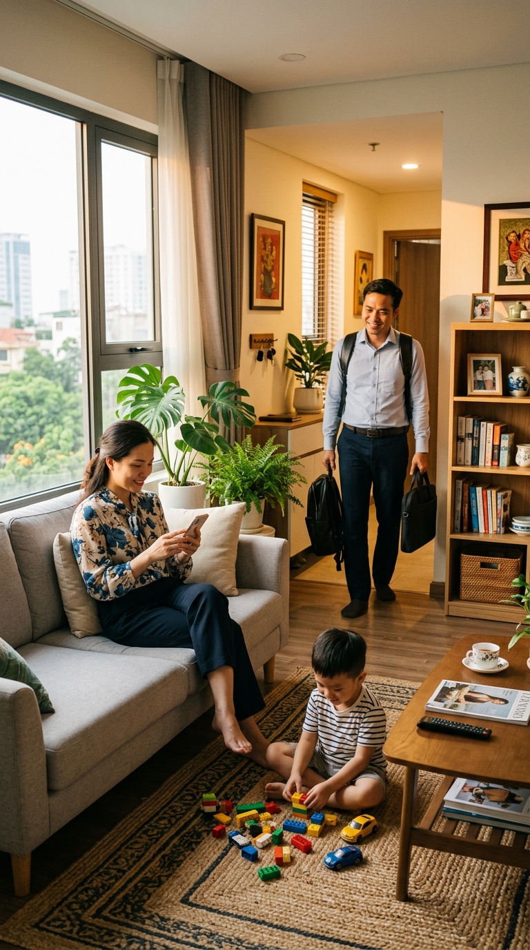 Sáng đưa con đi học, đi làm, chiều về đón con, nấu ăn, dỗ con ngủ.