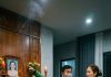 Trên bức tường lớn đối diện sofa, một di ảnh được...