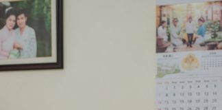 Trên bức tường lớn đối diện sofa, một di ảnh được...